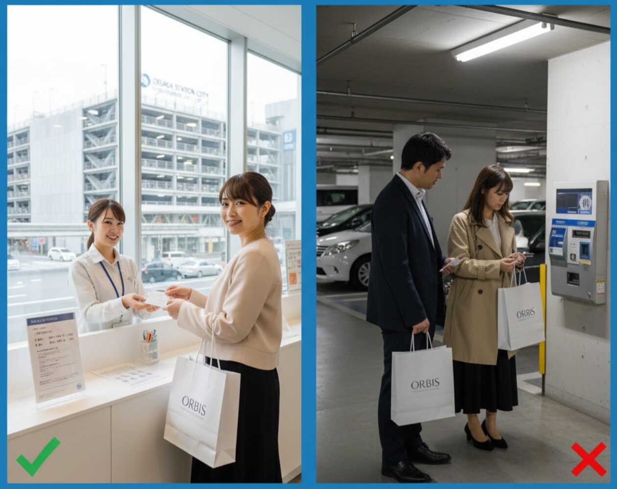 ルクア大阪店が入っている「大阪ステーションシティ」には提携駐車場(大阪ステーションシティ駐車場、サウスゲートビル地下駐車場など)があり、オルビスの店舗での購入ももちろん割引サービスの対象になります。