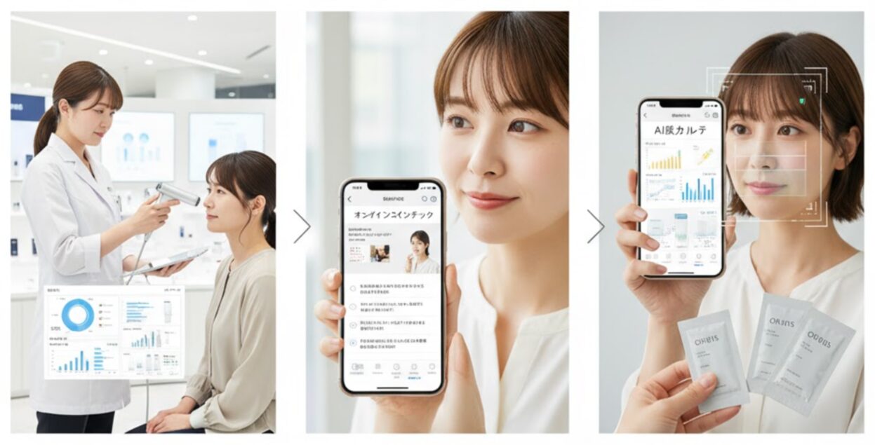 これは、AIによる肌の分析結果や、アプリからの質問への回答をもとに、一人ひとりの肌の状態や悩みに寄り添い、必要なスキンケア方法(「肌カ.ル.テ」コース)を提案してくれる「美容伴走型」のプログラムなんです。